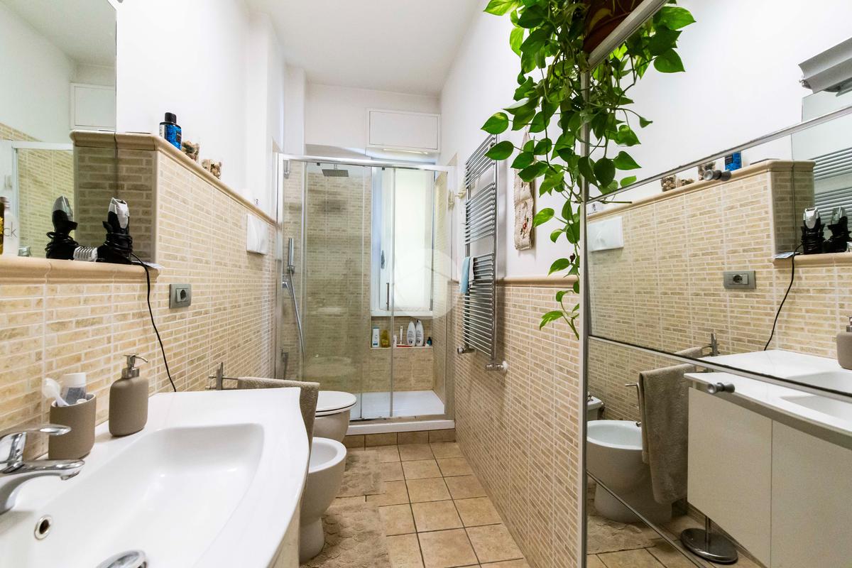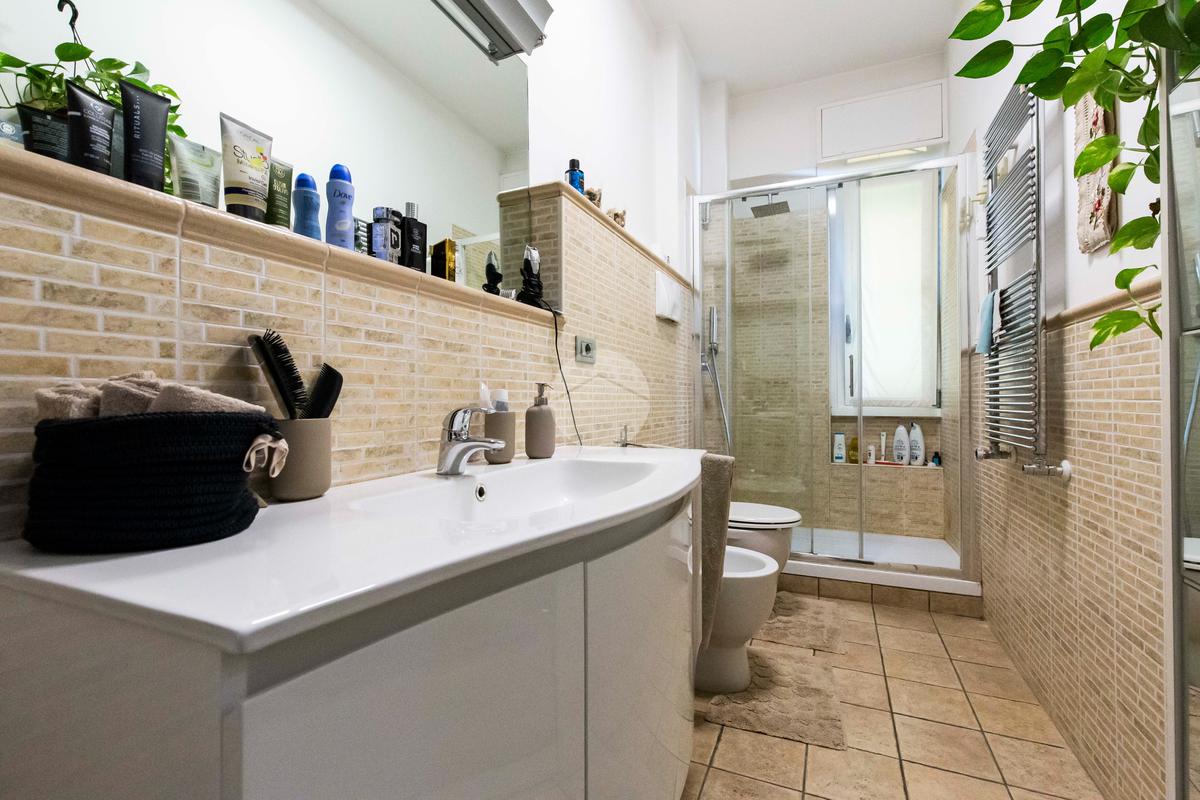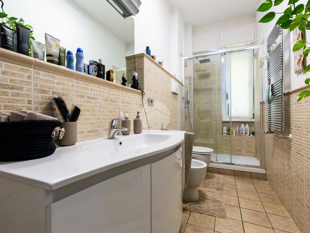 Il bagno finestrato è completo di box doccia in vetro, sanitari moderni, termoarredo e rivestimenti in ceramica in tonalità neutre, che donano all’ambiente un aspetto pulito ed elegante.