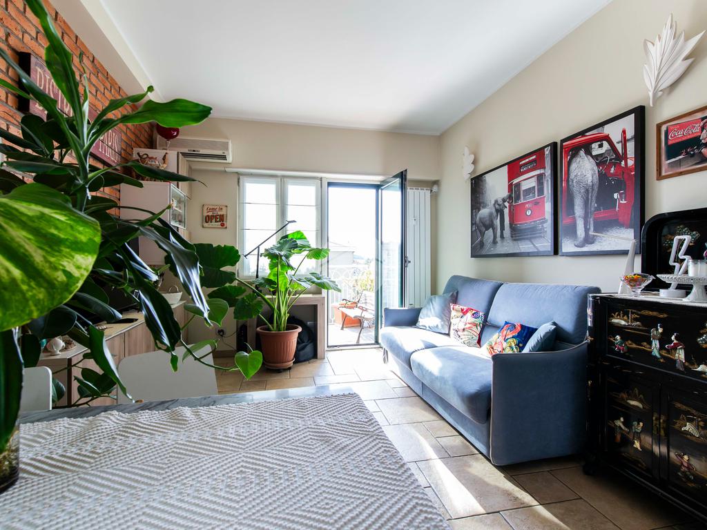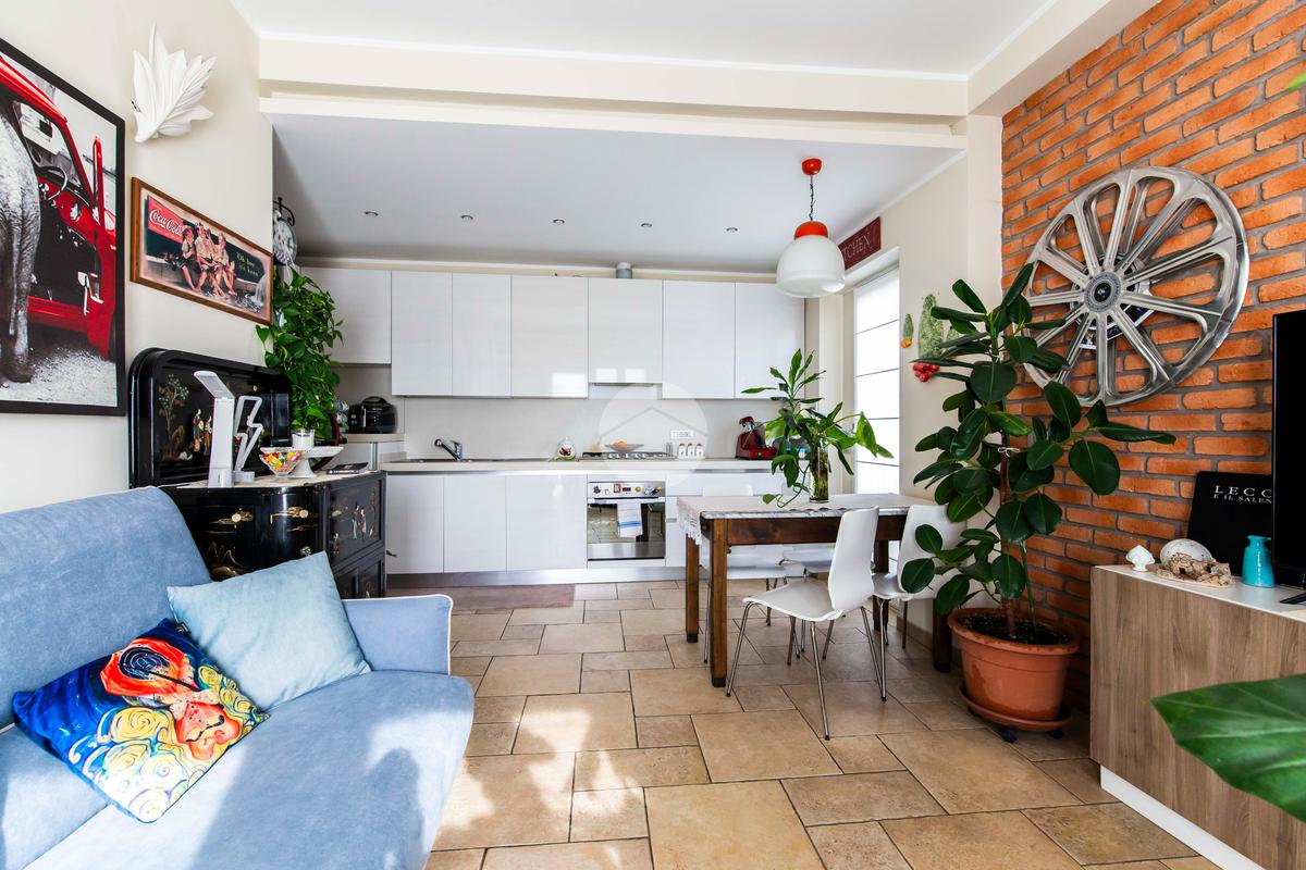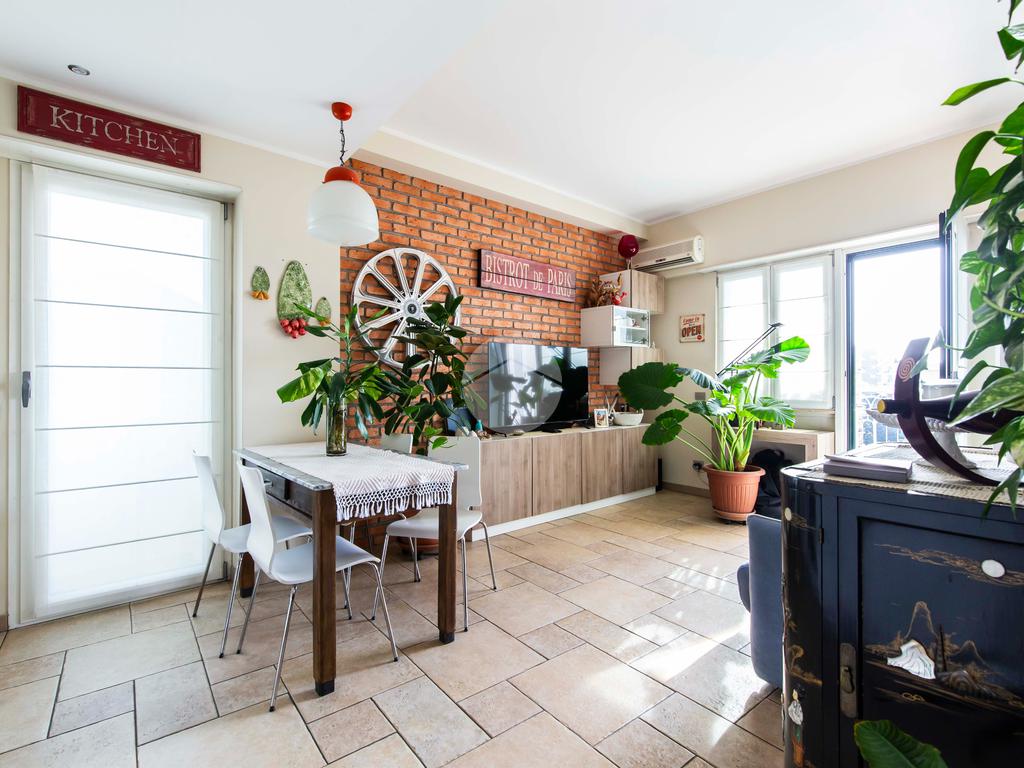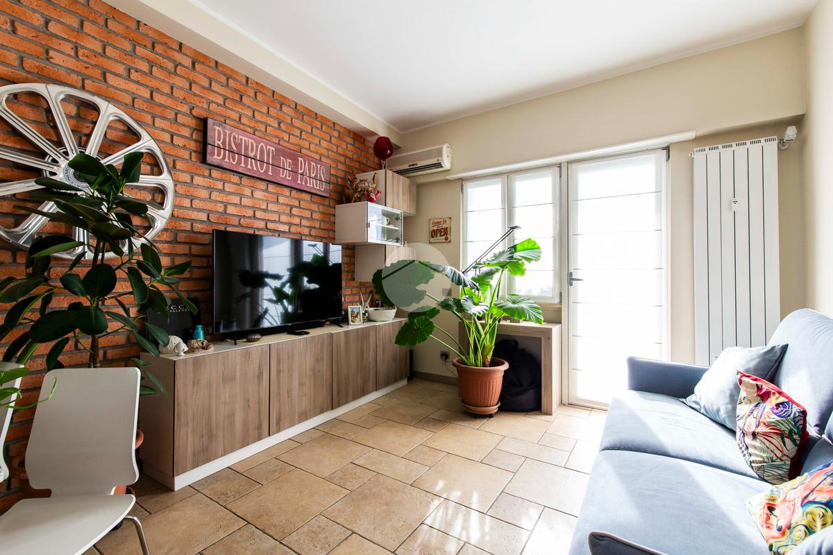 Il soggiorno, ampio e arioso, rappresenta il cuore dell’abitazione: l’elevata luminosità è garantita dall’accesso ai due balconi con affaccio aperto e panoramico sulla via principale.