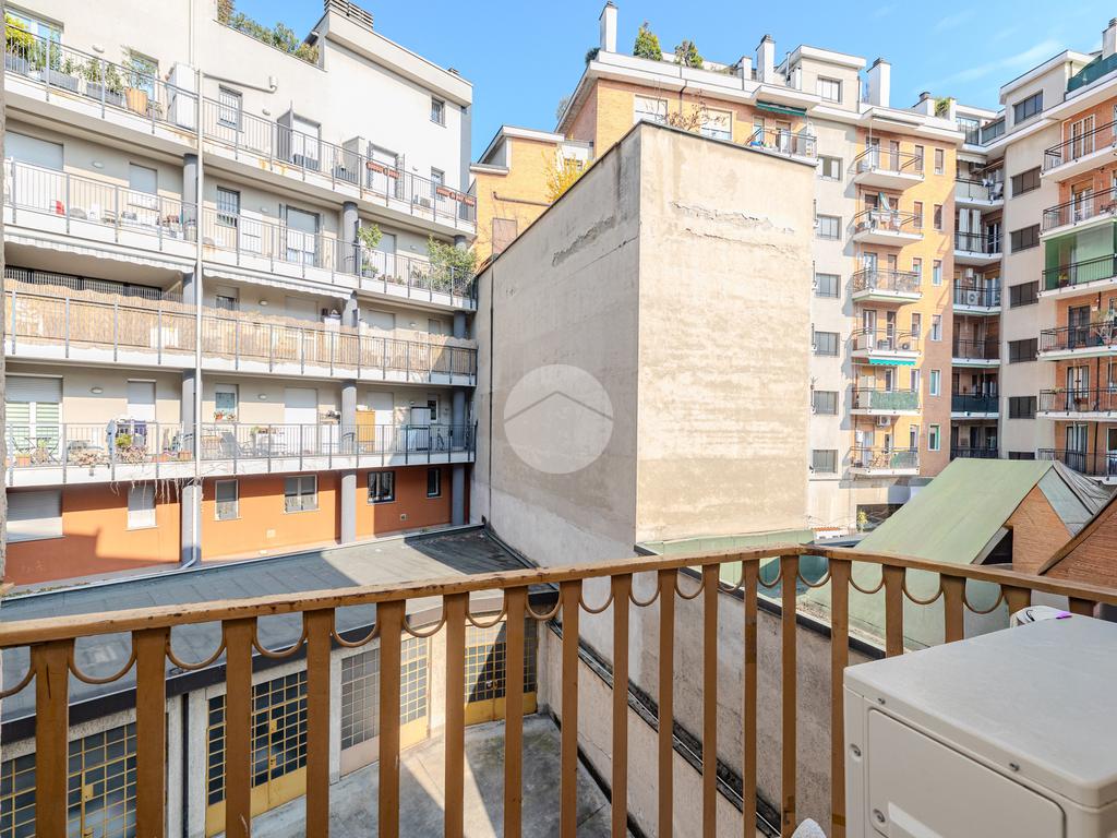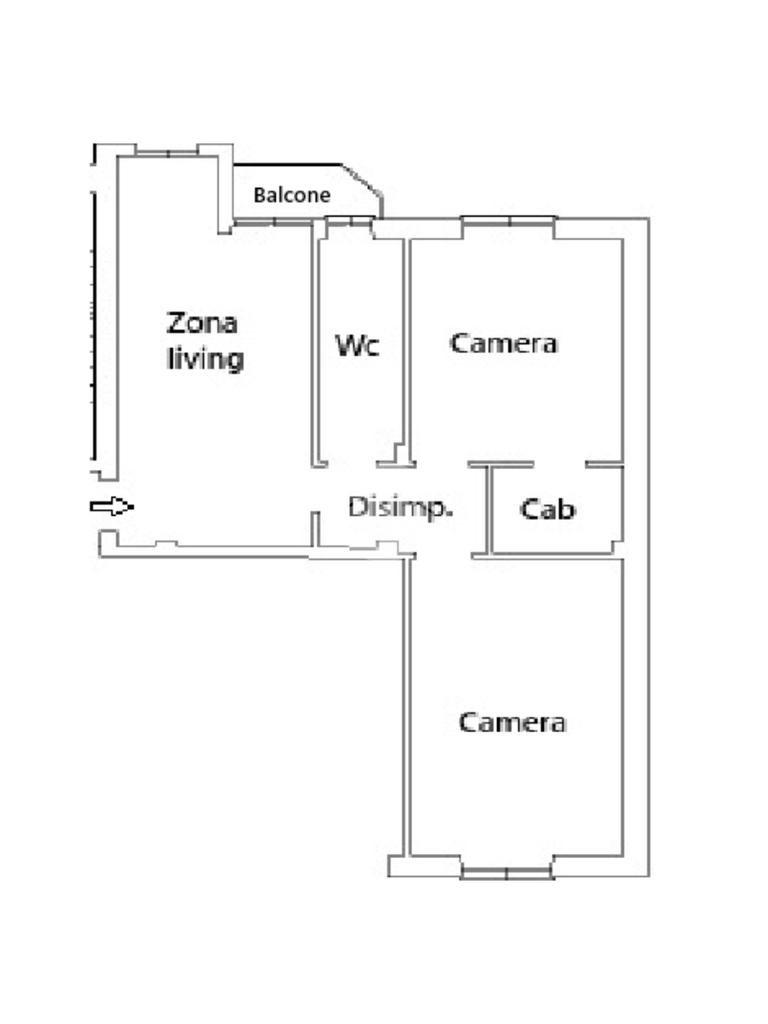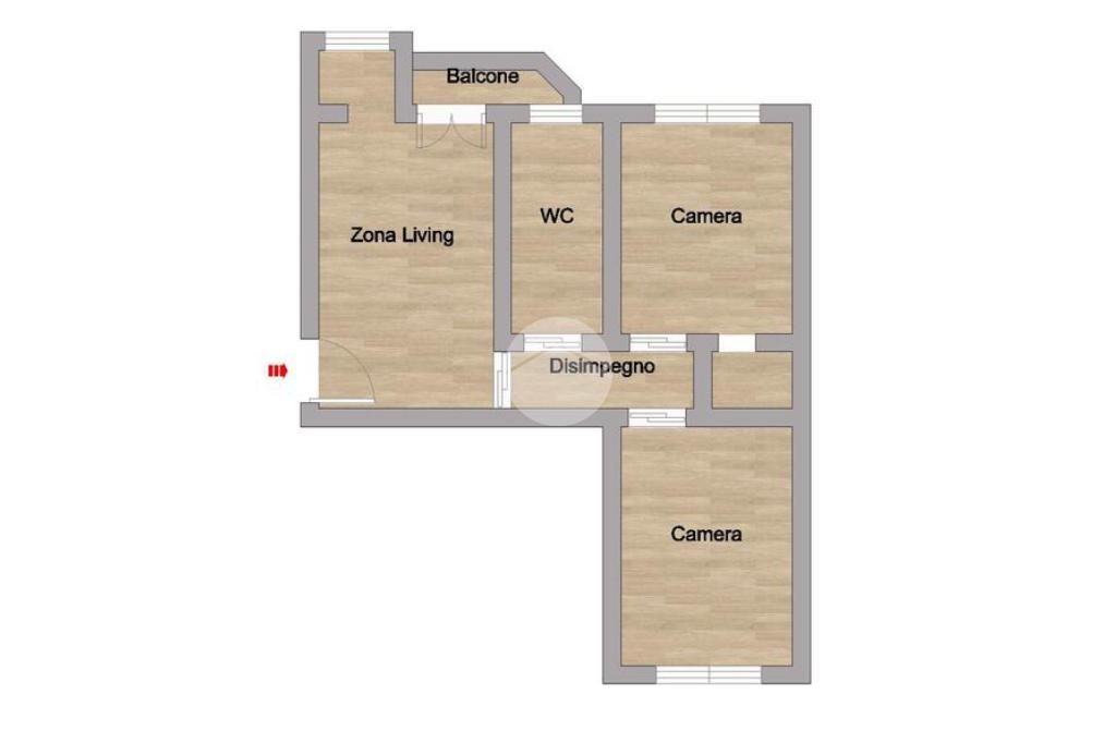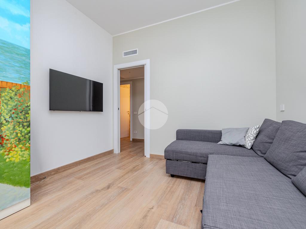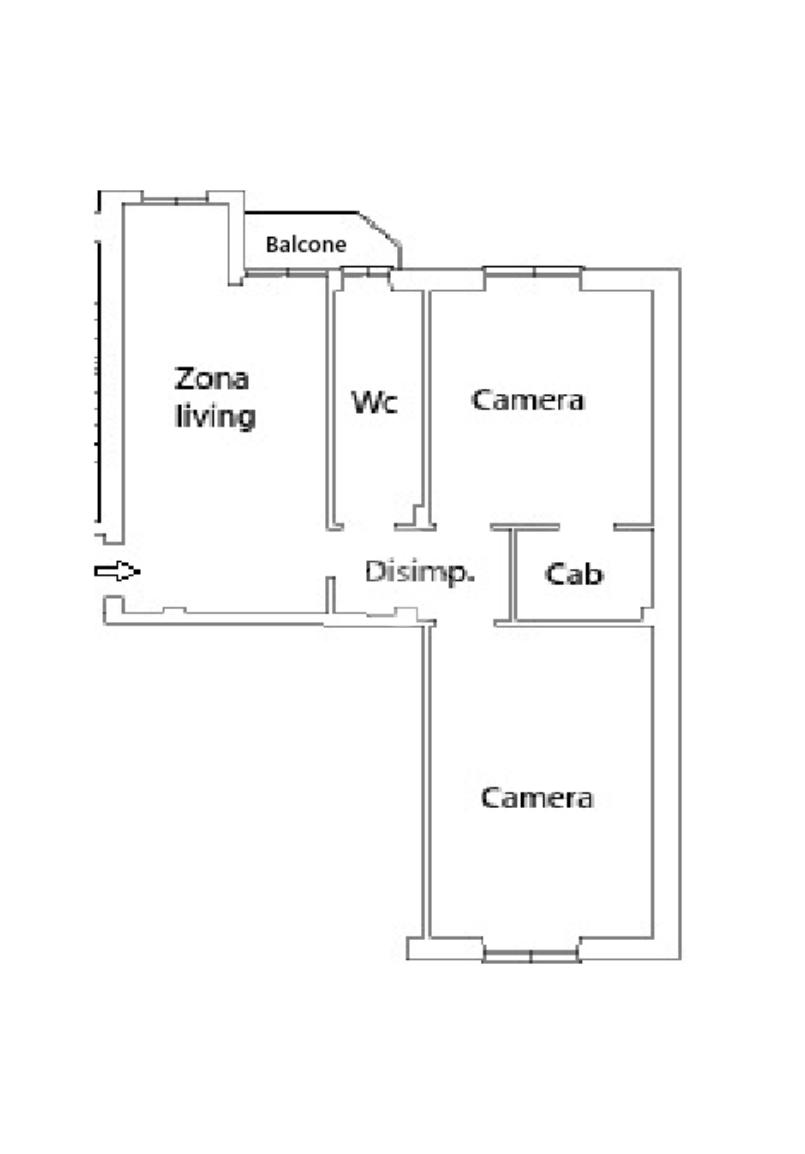 Ingresso in disimpegno che conduce, sulla sinistra, alla spaziosa e luminosa zona living con cucina a vista e porta finestra che dà accesso al balcone dell’immobile, con piacevole affaccio su corte interna.