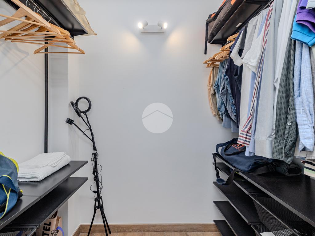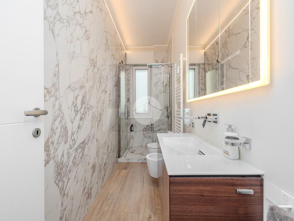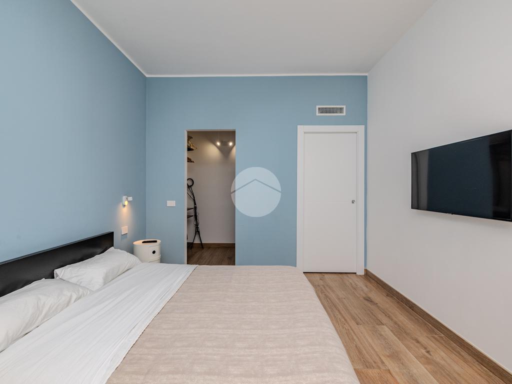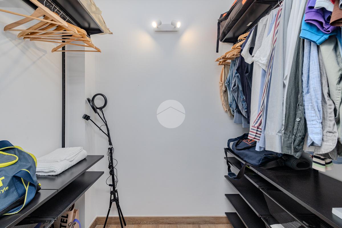 Proseguendo dritto dal disimpegno troviamo, sempre a sinistra, l’accesso al bagno finestrato con ampio box doccia caratterizzato dalle raffinate rifiniture in marmo; e subito dopo abbiamo accesso alla prima e luminosa camera matrimoniale dell’immobile, la quale è caratterizzata dalla comoda cabina armadio.