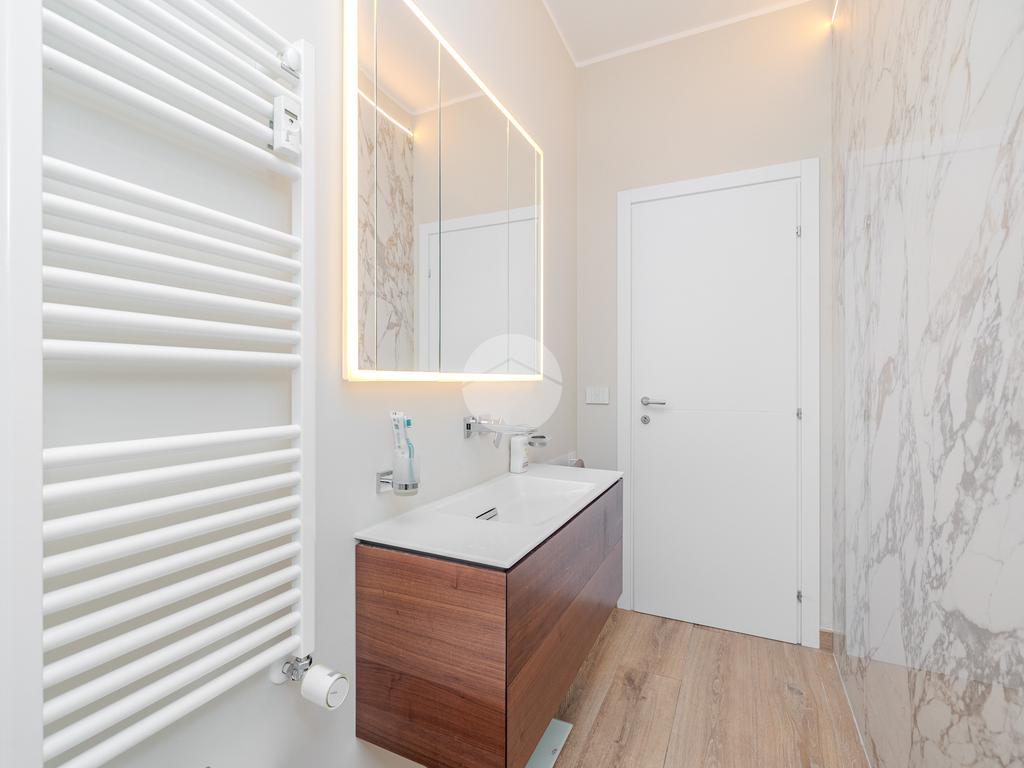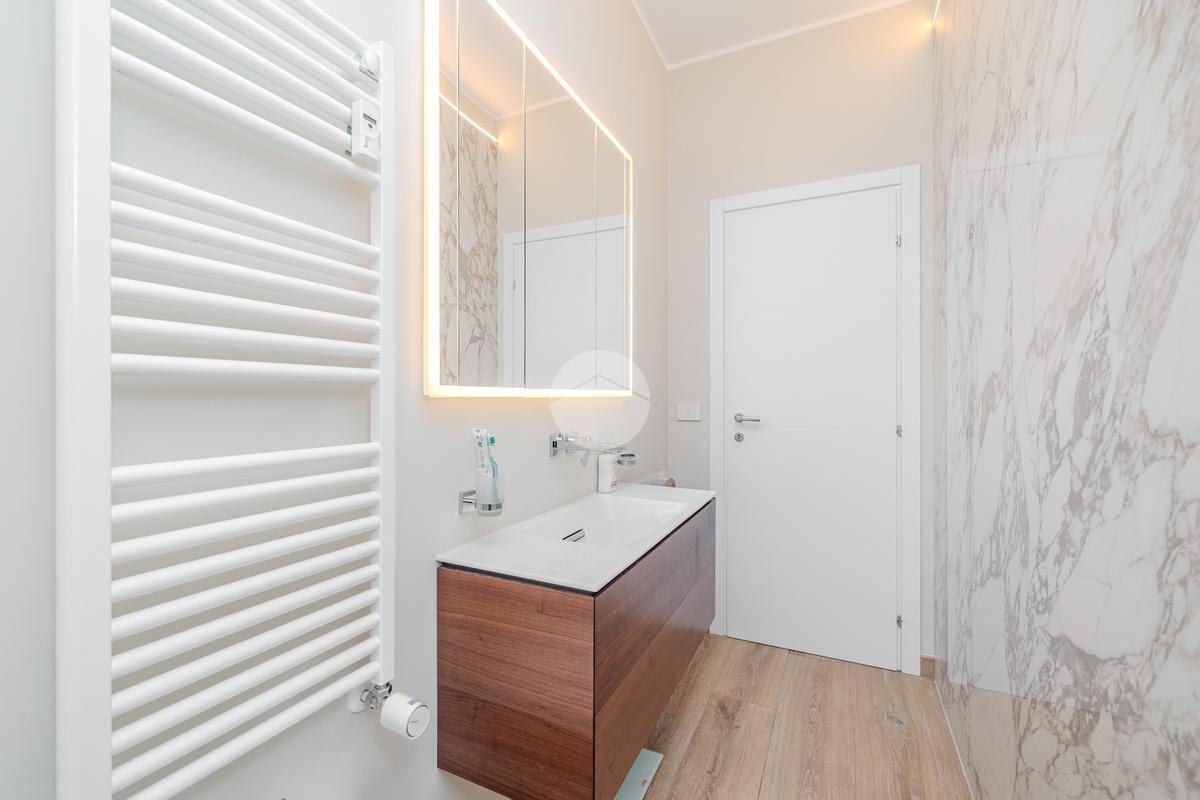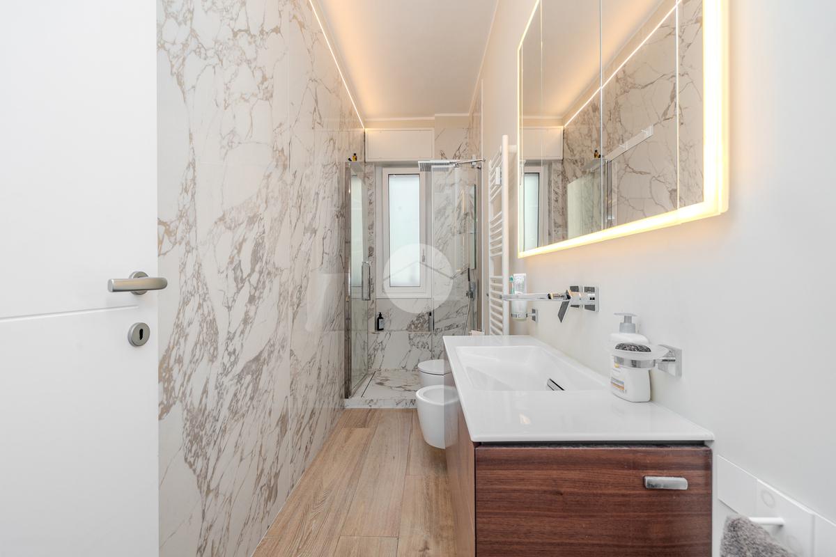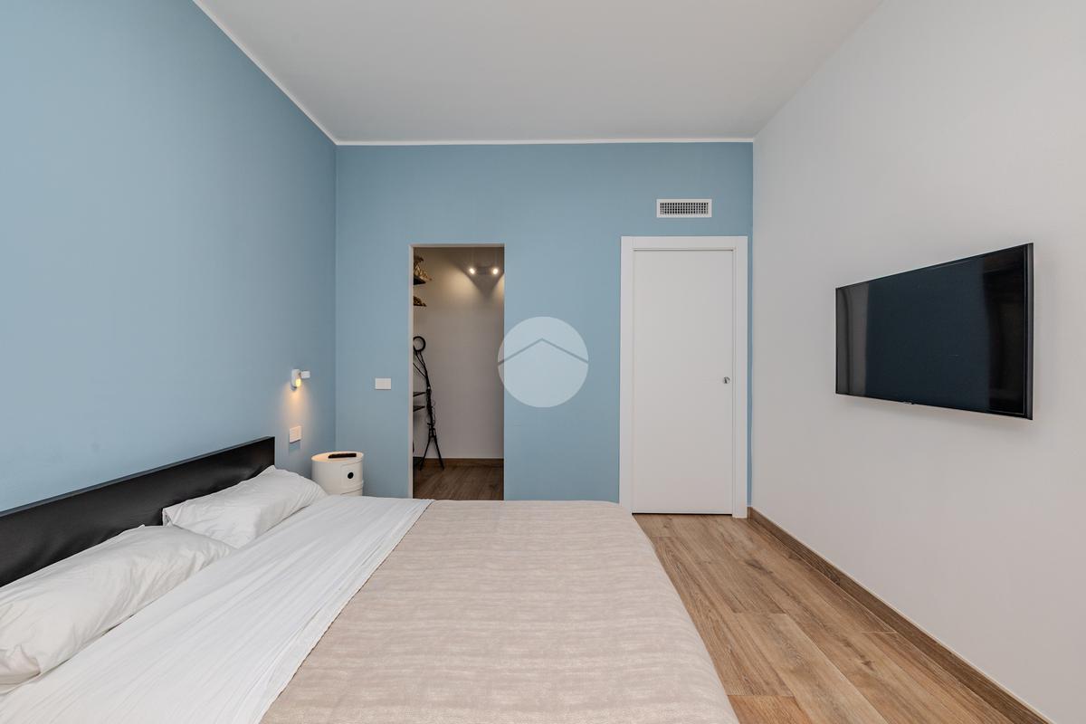 Proseguendo dritto dal disimpegno troviamo, sempre a sinistra, l’accesso al bagno finestrato con ampio box doccia caratterizzato dalle raffinate rifiniture in marmo; e subito dopo abbiamo accesso alla prima e luminosa camera matrimoniale dell’immobile, la quale è caratterizzata dalla comoda cabina armadio.